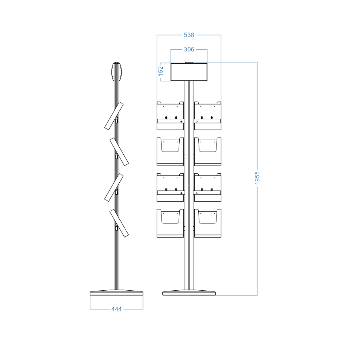 Здесь достаточно места, чтобы разместить до 64 каталогов толщиной 5 мм. А верхний фриз как раз предназначен для названия вашей компании или события. Просто распечатайте желаемое изображение и вставьте в рекламное поле.