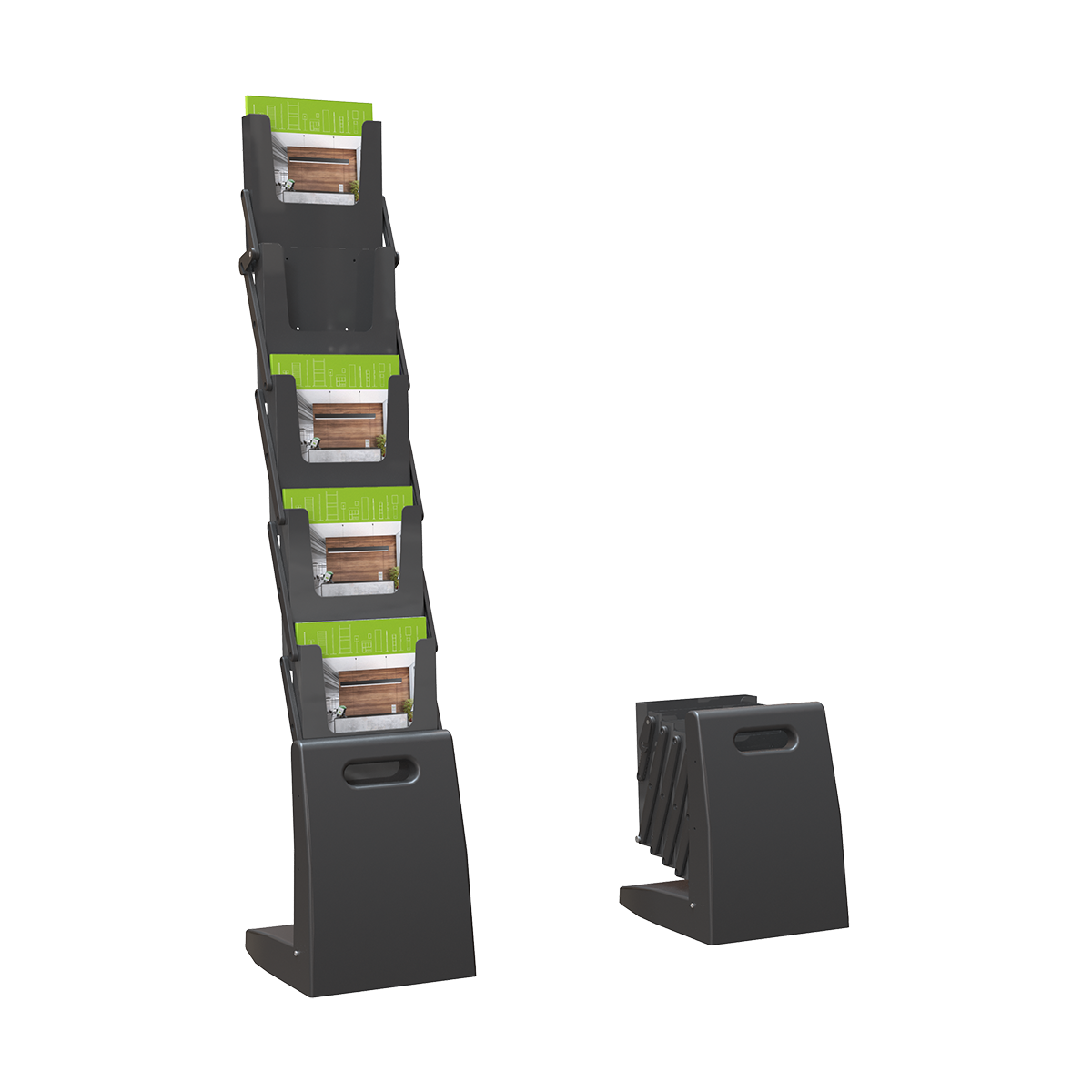 Корпус буклетницы черной доработали, - теперь есть эргономичная ручка для фиксации и подъема стойки, а крепежи для установки надежнее прежних. Как и прежде, корпус выполнен из 5-ти акриловых полок, весит незначительно, а в сложенном состоянии практически не занимает места. Напольная мобильная стойка Веер вмещает до 40 буклетов формата А4 толщиной 5 мм. Кейс классического черного цвета добавляет элегантности и стиля вашему образу делового человека. Буклетница идеальна для выставок и выездных мероприятий.