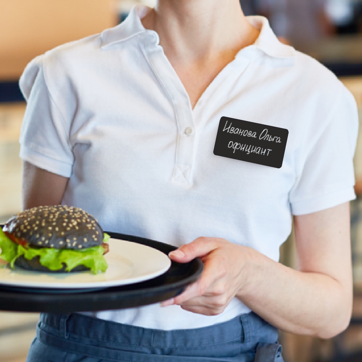 Используйте во время конференций и выставок, на образовательных мероприятиях, где участники сами заполняют информацию о себе и компании, в ресторане и кафе для обозначения имен официантов, что создает дружелюбную атмосферу.