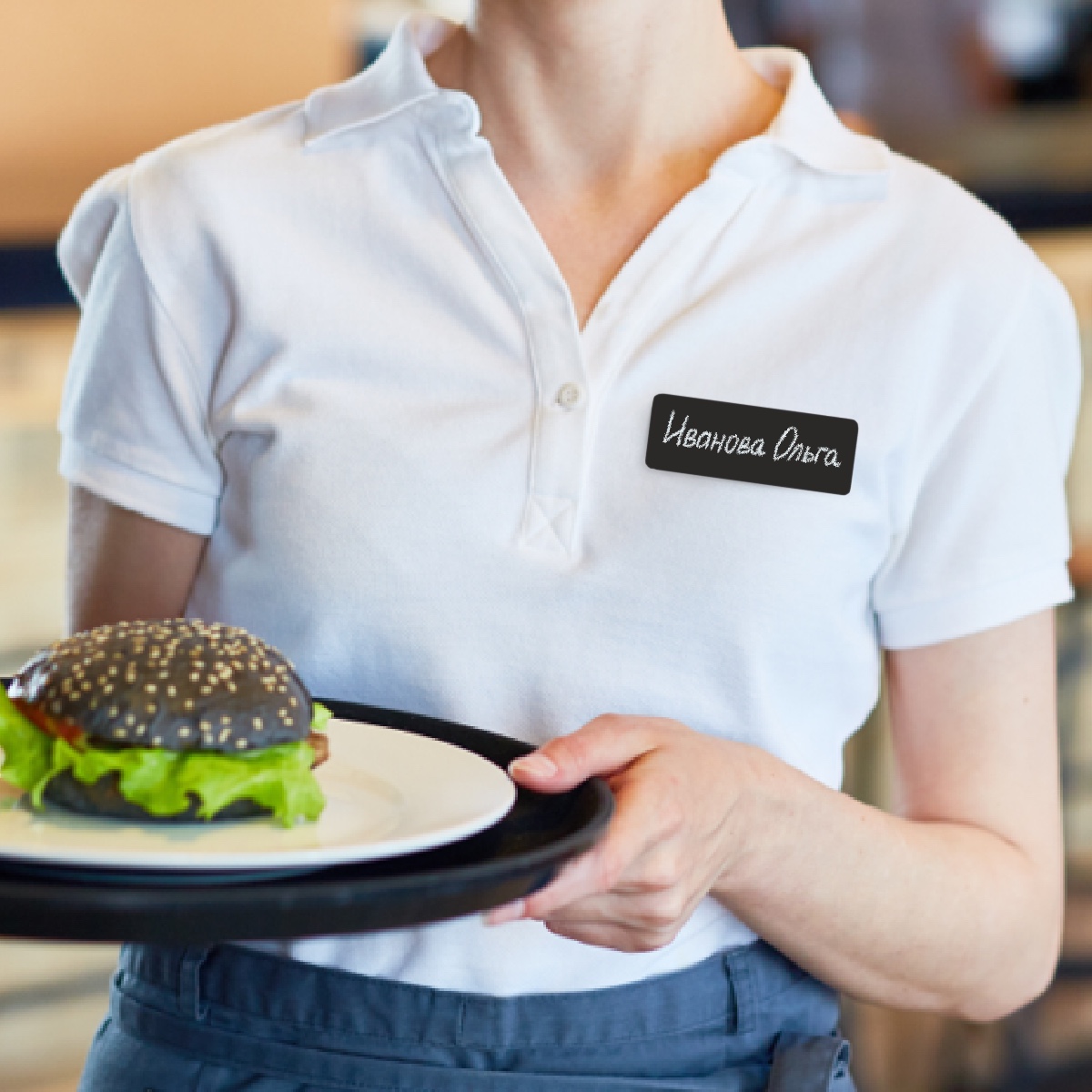 Используйте во время конференций и выставок, на образовательных мероприятиях, где участники сами заполняют информацию о себе и компании, в ресторане и кафе для обозначения имен официантов, что создает дружелюбную атмосферу.