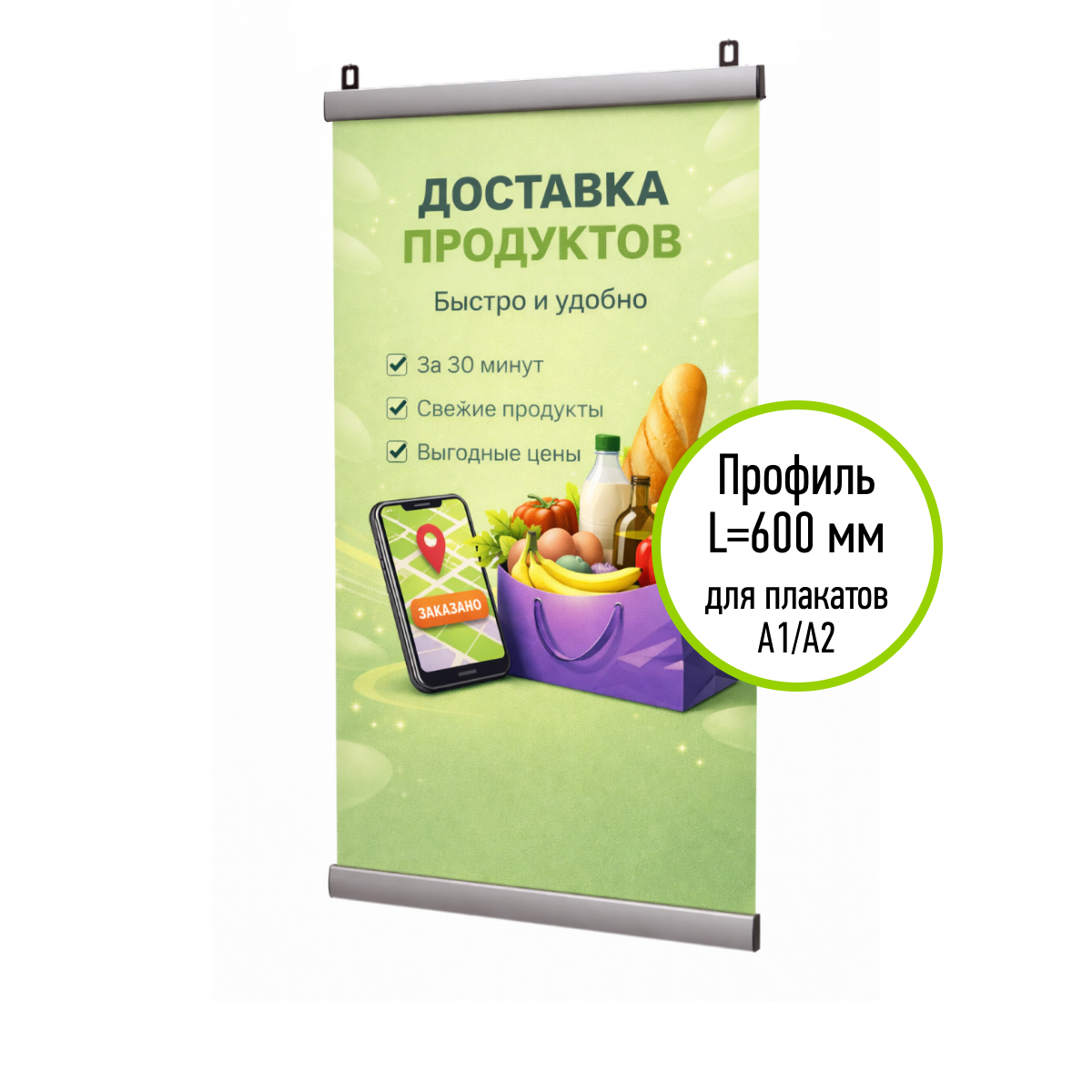 Такой комплект активно используйте для навигации в торговом зале, размещения акционной информации. В дополнение закажите трос для подвешивания к потолку, когда стены нельзя сверлить. Постер-изображение напечатаем по вашему макету или предложим свой.