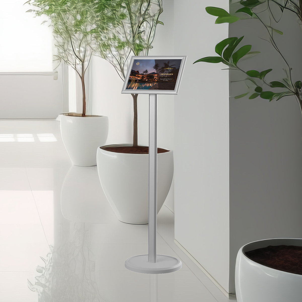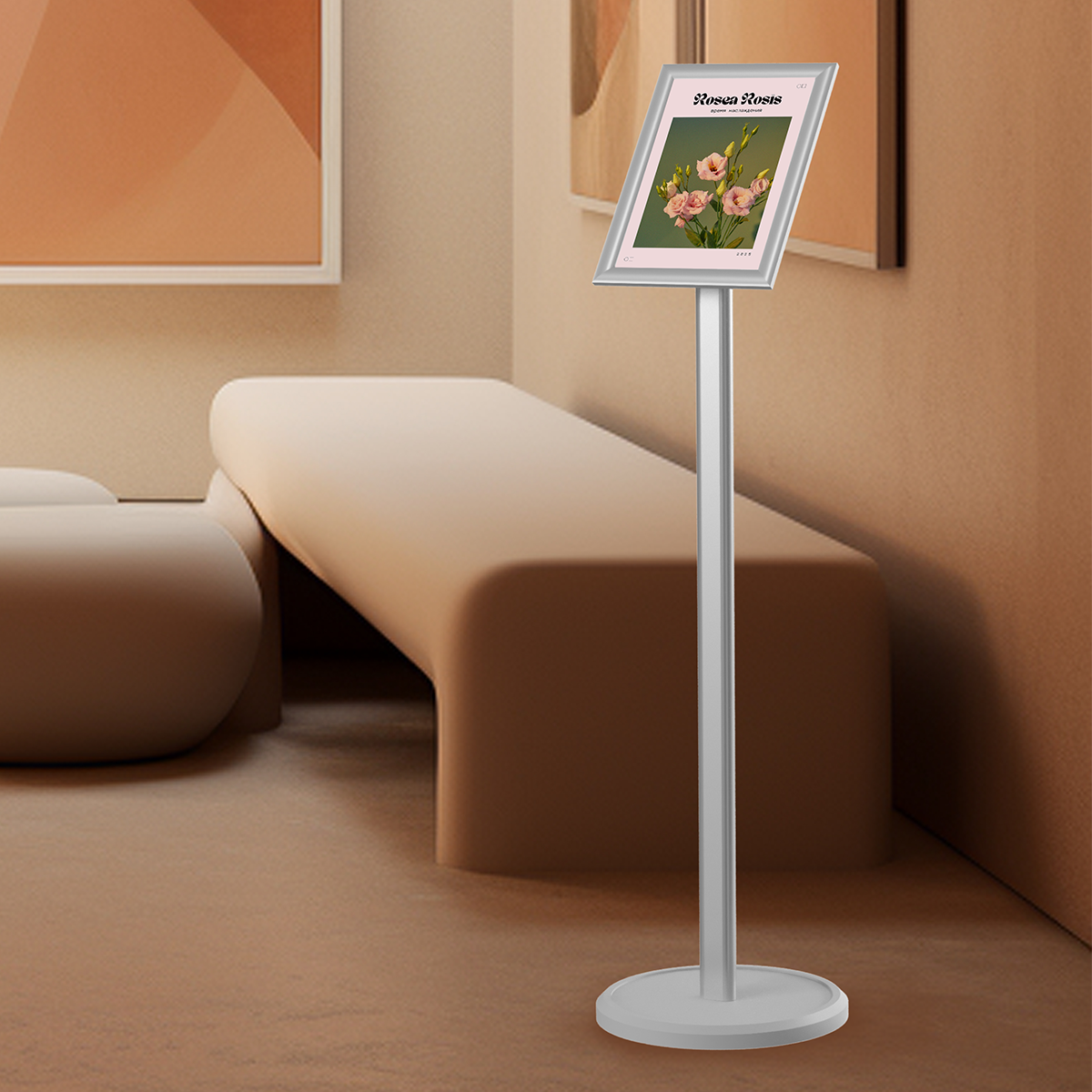 Стойка изготовлена из анодированного алюминия. Прочная и долговечная, при весе 4,5кг относительно легкая. Анодированное покрытие предохраняет алюминий от окисления, имеет более высокие эксплуатационные характеристики чем необработанный алюминий и высокие эстетические свойства. Мягкий металлический блеск покрытия придает стойке презентабельный внешний вид. Дополняет стойку устойчивое, влагостойкое композитное основание ø330мм, h=30мм. Для смены изображения отщелкните профиль рамки с 4-х сторон, поместите постер под защитный вкладыш, защелкните профиль. Антибликовый вкладыш из ПЭТ, при необходимости, можно заменить.